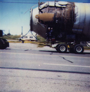 That's me sitting under the lifting hanger. I am steering the dollys (wheels), a diesel truck is pulling, another is pushing. Picture taken in 1986.